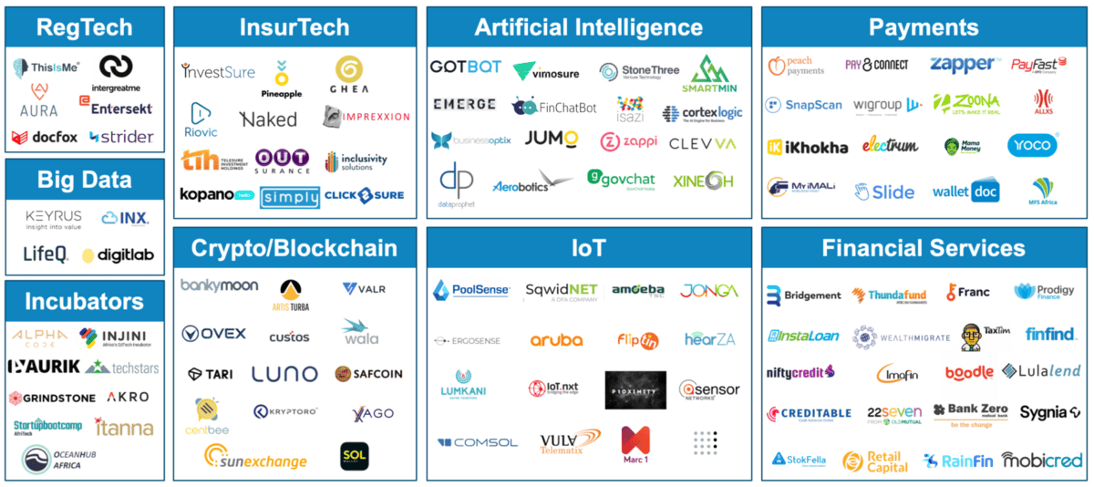 Next up, we explore the Fintech Ecosystem in SA, the picture below is a cross-section of some Startups in SA.